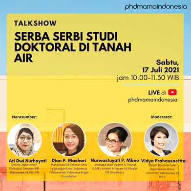 Menjalani studi S3, di mana pun lokasi studinya, tentu membawa tantangan tersendiri. Tulisan kali ini membahas tentang warna-warni perjuangan studi S3 di tanah air yang dirangkum dari Talkshow PhD Mama Indonesia yang bertajuk “Serba-Serbi Studi Doktoral di Tanah Air”. Talkshow yang diselenggarakan oleh PhD Mama Indonesia beberapa saat yang lalu dan dimoderatori oleh Vidya Prahassacitta (Dosen Bina Nusantara University) dan menghadirkan tiga orang narasumber, yaitu Narwastuyati P. Mbeo atau yang bisa disapa dengan Naya (alumni program S3 Filsafat STF Driyarkara Jakarta), Ati Dwi Nurhayati (S3 di jurusan Pengelolaan Sumber Daya Alam dan Lingkungan IPB), dan Dian P. Mashari (S3 Sekolah Ilmu lingkungan Universitas Indonesia).