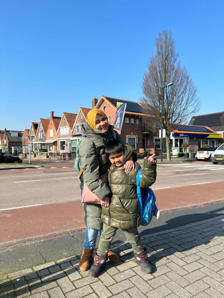 Misalnya, anak saya (umur 6 tahun—red) kesulitan untuk mendapatkan sekolah yang mau menerima dia waktu baru pertama kali datang. Ketika dia belum mendapatkan sekolah, otomatis saya jadi nggak bisa ngapa-ngapain. Setelah mendapatkan sekolah pun, masih ada tantangan untuk anak saya dalam penyesuaian iklim, kultur budaya, dan penggunaan bahasa lokal. Hal-hal inilah yang terkadang membuat anak saya ingin menyerah dengan bilang bahwa dia ingin pulang ke Indonesia. Untuk itu, saya berusaha perlakukan anak selayaknya teman. Saya tanyakan apa yang membuat dia lelah dan ingin menyerah lalu apa yang kira-kira dapat membantu dia mengatasi hal tersebut. Jika dia tidak memahami apa hal yang dapat menjadi solusi, saya akan menawarkan beberapa opsi solusi, dan dia akan memilih opsi mana yang diinginkan. Pada akhirnya, kami dapat menemukan solusi bersama dengan metode diskusi seperti itu. Saya selalu meminta anak saya untuk dapat melakukan teamwork dengan saya selama menjalani hidup di Belanda agar dia merasakan kehidupan di Belanda tidak lebih dari hanya sekadar permainan. Saya ingatkan dia agar kami dapat menjalankan tugas masing-masing, bahwa jika salah satu menyerah maka kerja tim akan gagal.